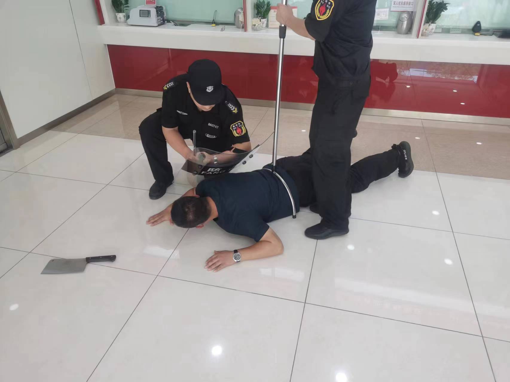 演練開始,“歹徒”攜帶刀具沖進營業廳企圖傷人,危害客戶與銀行工作人員人身安全,面對“歹徒”威脅,保安隊員沉著冷靜勸說“歹徒”,同時組織安保人員對其攔截,有序疏散人員并及時報警,最終在保安與工作人員的緊密配合下將“歹徒”成功控制,保證了人員和財物的安全。