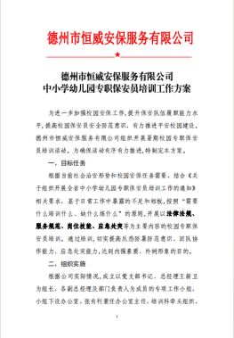 為貫徹落實德州市公安局、德州市教育和體育局《關于組織開展全市中小學幼兒園專職保安員培訓工作通知》要求,結合市公安局保安專題培訓,進一步提升中小學幼兒園專職保安員綜合素質,增強反恐防暴意識,提高校園保安員對突發暴力事件的應對能力,全力保障校園安全有序穩定。德州市恒威安保服務有限公司高度重視,立即安排部署相關工作。