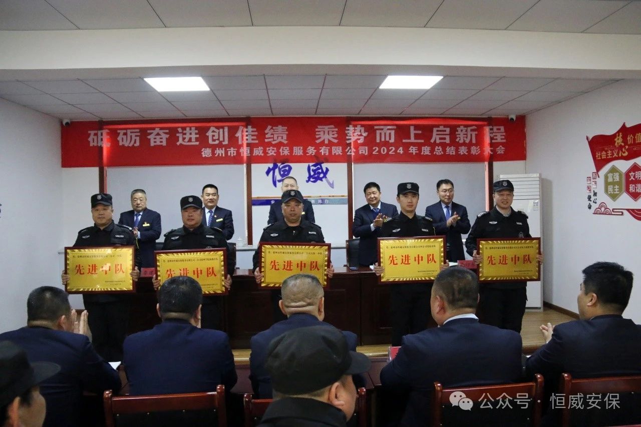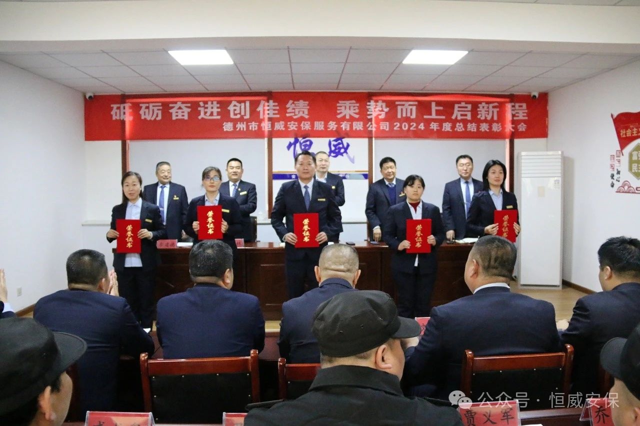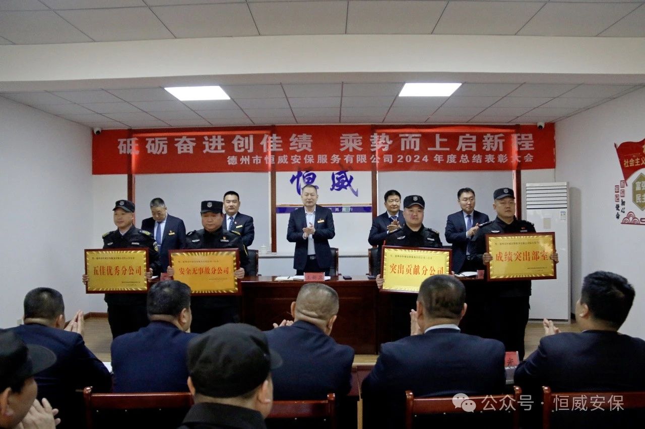 為表彰先進、激勵斗志,總結成績、展望未來,2025年2月19日上午,德州市恒威安保服務有限公司召開2024年度總結表彰大會,公司領導、各級管理人員以及獲得表彰的先進集體代表、優秀管理者、優秀班長、優秀員工代表共60余人參加大會,會議由公司副總經理張玉濤主持。